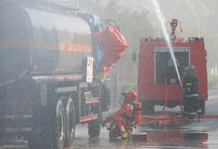 演練模擬了廣州保賜利化工有限公司內(nèi)一臺20立方米容量載有154噸丙酮的槽車在卸車時,發(fā)生泄漏,安檢巡查人員發(fā)現(xiàn)后,立刻向現(xiàn)場負責人報告,現(xiàn)場負責人起動預(yù)案組織搶險,但因過于慌亂,損壞了槽車閥門,泄漏無法控制。廣州保賜利化工有限公司立即向鰲頭鎮(zhèn)匯報了情況,并向110、從化市應(yīng)急辦及從化市安全生產(chǎn)監(jiān)督管理局報警,請求救援。接到報警后,市各應(yīng)急救援部門抵達事故現(xiàn)場,成立應(yīng)急救援指揮部,并根據(jù)現(xiàn)場情況,指揮部命令成立應(yīng)急救援攻堅隊,消防大隊通過偵查后遂展開全面救援。通過三項救援方案:一是組織現(xiàn)場搶險人員,封堵罐區(qū)對外排水出口,并用沙袋、水泥灰等筑起防護堤,防止泄漏流淌面積進一步擴大;二是組織有效力量,對槽車進行冷卻,稀釋空氣中的丙酮;三是利用干粉、水泥灰和泡沫配合進行滅火,經(jīng)過25分鐘的救援,大火終于被撲滅,并成功堵漏。最后各相關(guān)職能部門對事故后序工作開展了相應(yīng)的處置,整個演練圓滿結(jié)束。
